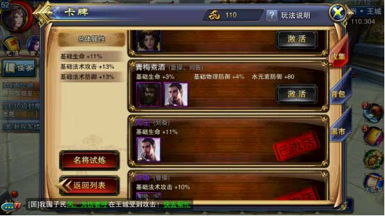 在《六龙争霸3D》,玩家可以通过名将试炼、卡牌钱庄、卡牌黑市等途径获得不同的卡牌,除了单个卡牌的属性外,集齐卡牌组合,还可以获得更为强力的卡牌属性加成。接下来就一起来了解下游戏中有哪些卡牌组合吧!玩家通过不同途径获得新的卡牌后,进入卡牌界面激活新的卡牌,卡牌激活的同时可永久增加属