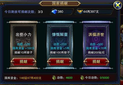 获得功勋最简单的方法就是每天三次的国家捐献,出些小力能够每次能够获得100点功勋,感慨解囊每次能够获得200点功勋,选择用钻石进行洪福济世捐献的话能够直接获得500点功勋。