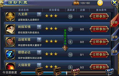 除了每天三次的捐献能够获得功勋以外,完成每日任务当中的九龙鼎,刺探军情、边境军需、镖镖必达、火烧敌营、无间道、国战、国探、国运等等有关于国家的任务也是可以获得数量不等的功勋点奖励。虽然是国家任务但有了免战牌的存在这些任务还是可以十分轻松的完成的。请诸位玩家们每天千万不要错过哦,详细内容可以通过主界面上面的活动面板进入查看。