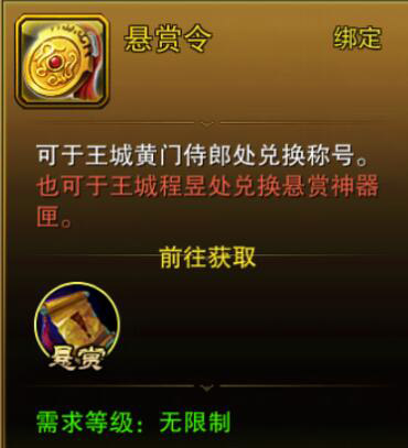 刷完指定数量的怪物之后,或者说等待一定的时间之后,玩家们可以通过任务面板再次进入悬赏界面完成任务,完成之后便可以获得经验值与悬赏令。悬赏令可以在王城黄梦侍郎处兑换称号,也可以在程昱处兑换悬赏神器匣。
