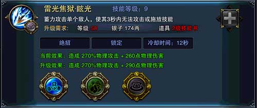 如:【雷光焦狱】拥有三个符文特效,一为冰寒:驱散敌人增益效果并减速50%,持续4秒;二为猛雷:定身敌人2.5秒;三为眩光:使敌人3秒内无法攻击或释放技能。单人PK中,我们根据控制为上的原则,对于此技能的符文选择应为:眩光>猛雷>冰寒。